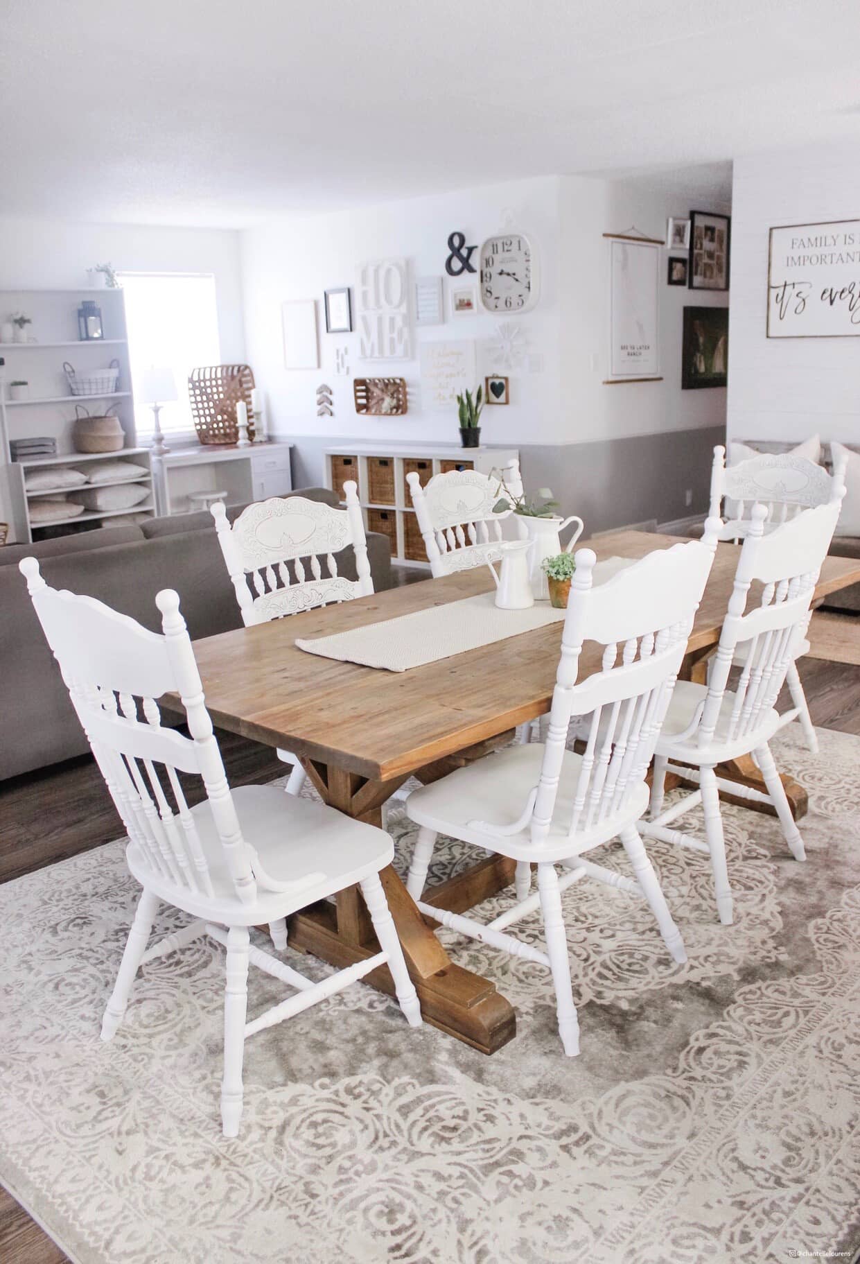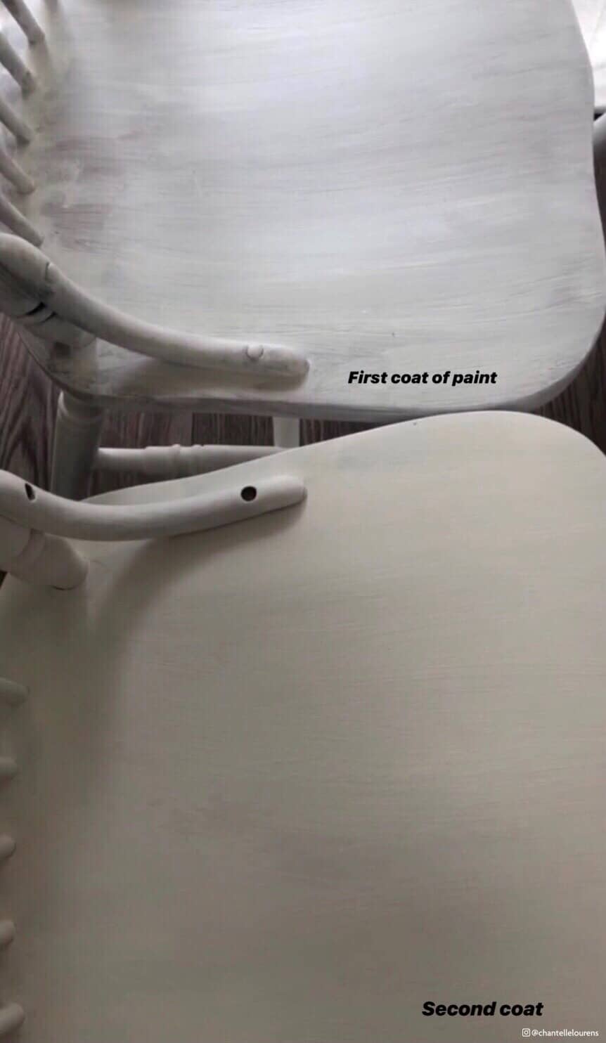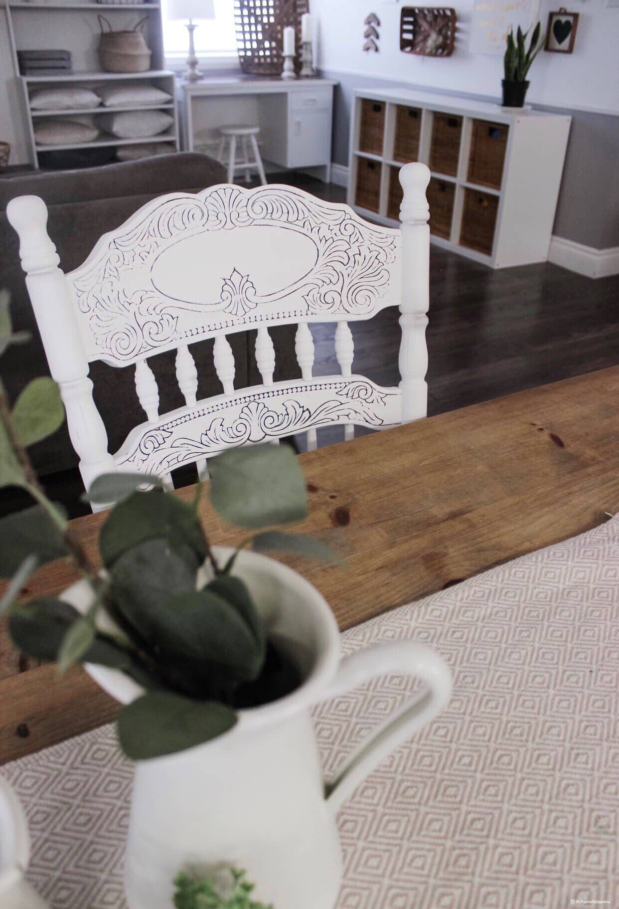I did 3 coats of paint on the chairs with an angled Beauti-Tone paintbrush. I left the top portion of the chairs untouched until step 2 because this is where I wanted the beautiful details of the pressback chairs to shine.