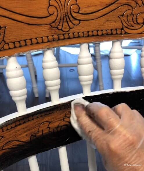 While I love the design at the top of the chairs, I didn’t want to leave it the orange oak colour, so I used Beauti-Tone Black Licorice (D35-1-0529-3) with another angled brush to paint over the details.
