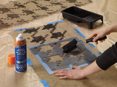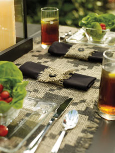 A houndstooth checkered pattern stenciled on burlap adds an interesting element to your table design. Cut the burlap to 17" x 60" (43 cm x 152 cm) and fray the edges. Lay the burlap on a plastic drop sheet and tape it down on all sides ensuring it is straight. Spray adhesive on the back of stencil and place in the centre of burlap. Using BeautiTone black exterior paint and a foam roller, remove excess paint on paper towel and then roll over stencil design on burlap. Repeat to fill the entire runner.