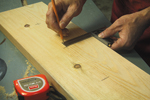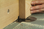 Tracez ensuite un trait sur le bois de bout du cèdre pour pouvoir réorienter les bandes dans la séquence d'origine, avant de refendre une bande de 3/4 po de largeur et une autre bande de 1/8 po de largeur.