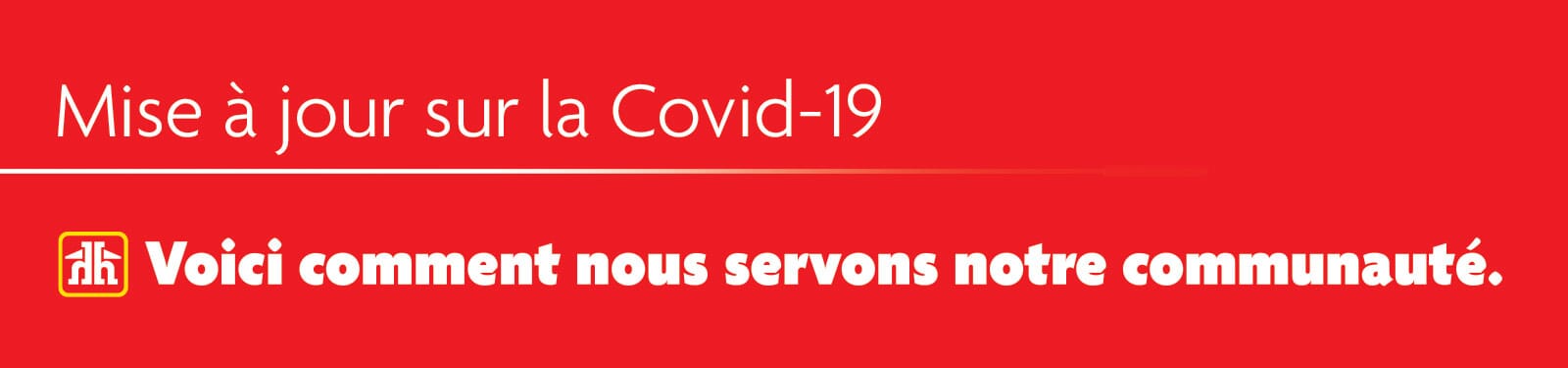 En tant qu’entreprise canadienne, nous comprenons que plusieurs de nos clients comptent sur nous pour trouver les produits nécessaires aux réparations urgentes de leur domicile. C’est pourquoi nous vous remercions de nous accorder votre confiance tandis que nous travaillons sans relâche pour nous réapprovisionner le plus rapidement possible. Les membres de nos équipes font un travail incroyable pour servir leurs communautés locales et nous sommes très reconnaissants de leur travail et de leur soutien. Sachez que la sécurité de nos clients, de notre personnel et de nos magasins est notre priorité absolue et que nous respectons les recommandations du gouvernement et des autorités sanitaires afin d'agir en tant qu’entreprise citoyenne responsable.