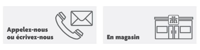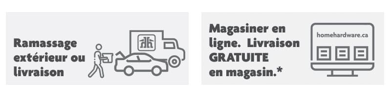 Le magasinage en ligne et le ramassage sont disponibles dans la plupart des magasins Home Hardware. Cependant, si vous n'avez pas sélectionné un magasin ou si votre magasin n'offre pas le service de ramassage en magasin, vous pouvez sélectionner un magasin qui offre ce service pour vos achats en ligne. De plus, certains articles ne peuvent pas être achetés en ligne, mais ils peuvent être disponibles en magasin ou offerts en commande spéciale. Vous n'avez qu'à appeler votre magasin Home pour vous renseigner sur la façon d'obtenir les articles.