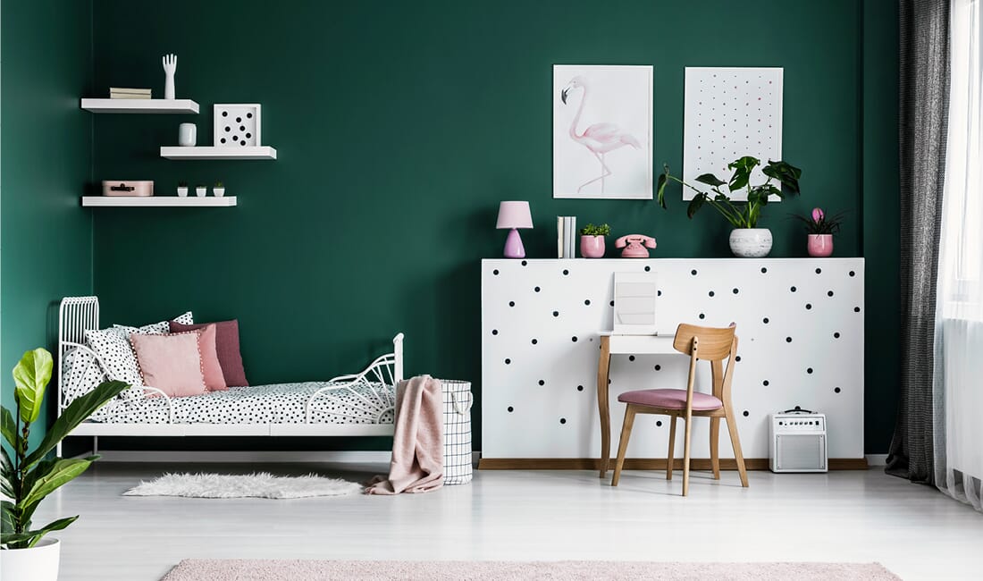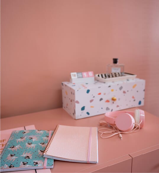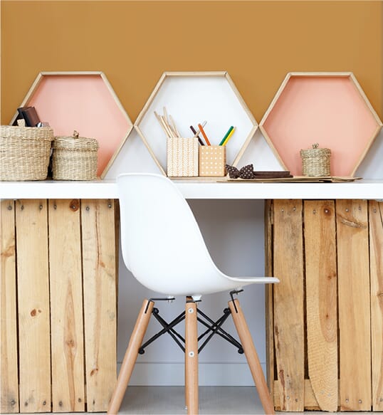 Ajoutez une touche de couleur à votre studio en janvier. Pleine de fraîcheur mentholée, Clairière chatoyante est la couleur parfaite pour apporter une énergie rayonnante aux alcôves et aux murs-décor. Accordez-la avec des meubles peints avec Enfant de la lune pour un contraste équilibré. Ou essayez un agencement monochrome rose en Mur de stucco. Appliquez sur les murs et les meubles et profitez de ce style ton sur ton dans votre aire d’étude.