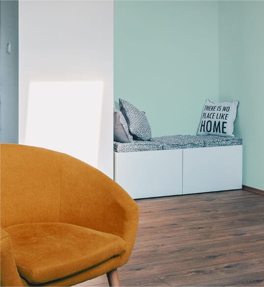 La chaleureuse teinte de blanc, Peau de wapiti, peut créer un espace à la fois rafraîchissant et calme pour les chambres à coucher et les chambres d’étudiant. Cette couleur naturelle illuminera non seulement votre pièce, mais donnera aussi une impression d’amplitude. Évitez de surcharger et décorez avec de la literie et des oreillers aux teintes chaudes, comme Enfant de la Lune et Mur de stucco, et gardez les meubles et la décoration au minimum.