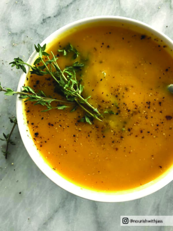 La courge musquée et les pommes vont bien ensemble et ramènent des souvenirs de l'automne. Le thermoplongeur Kuraidori en combinaison avec la méthode sous-vide constituent une façon plus rapide de faire cuire une soupe. Les saveurs se combinent sous la pression du vide plus rapidement et avec moins de perte de nutriments que par les méthodes ordinaires (sur la cuisinière). On ajoute de la crème épaisse à chaque bol de soupe pour plus de richesse. On peut également compléter la soupe avec quelques tranches de pommes fraîches pour une texture supplémentaire.