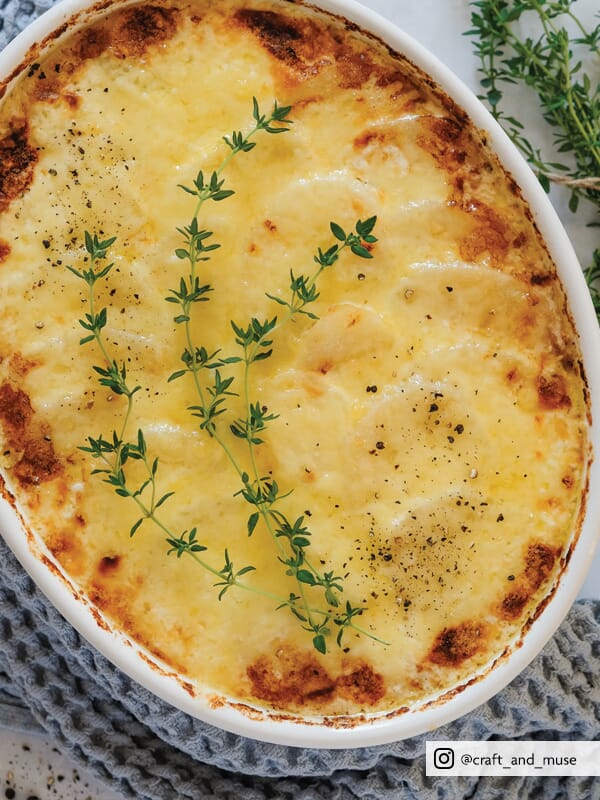 De nombreuses recettes de pommes de terre gratinées traditionnelles produisent des pommes de terre cuites de façon inégale dans une sauce lourde coagulée. La cuisson sous vide cuit de façon uniforme et garantit que toutes les pommes de terre sont bien cuites. Ajouter de la crème aux pommes de terre au cours du processus de cuisson sous vide pour créer une base riche en saveur. Cette recette nécessite un peu de temps au four pour bien combiner le tout ensemble et faire dorer le fromage en dessus. Nous vous suggérons d'utiliser des pommes de terre Russet, en tranches minces, car elles donnent la meilleure texture et la meilleure saveur.