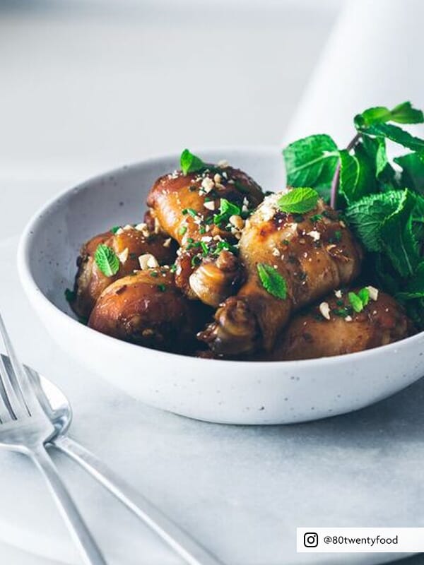 Souvent, les pilons de poulet peuvent finir filandreux et insuffisamment cuits. Cette recette produit un poulet juteux et bien cuit. La sauce au caramel style traditionnel vietnamien équilibre le plat avec le caramel aigre-doux aux saveurs salées et épicées. Veuillez faire attention en utilisant votre gril du four à ne pas brûler le poulet lors de la fin du processus de cuisson.