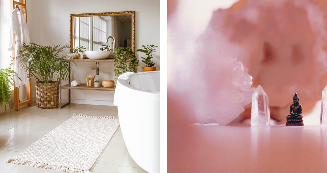 qui atténue le stress. Agencez-les avec des accessoires blancs, du bois naturel et de la pierre, ornés d’accessoires